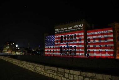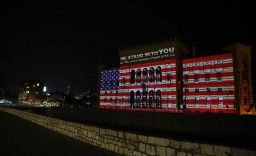 Vijećnica osvijetljena u bojama zastave SAD-a