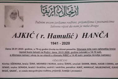 Na Ahiret preselila Ajkić (rođ. Hamulić) Hanča