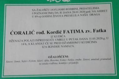Na Ahiret preselila Ćoralić (rođ. Kordić) Fatima zvana Fatka