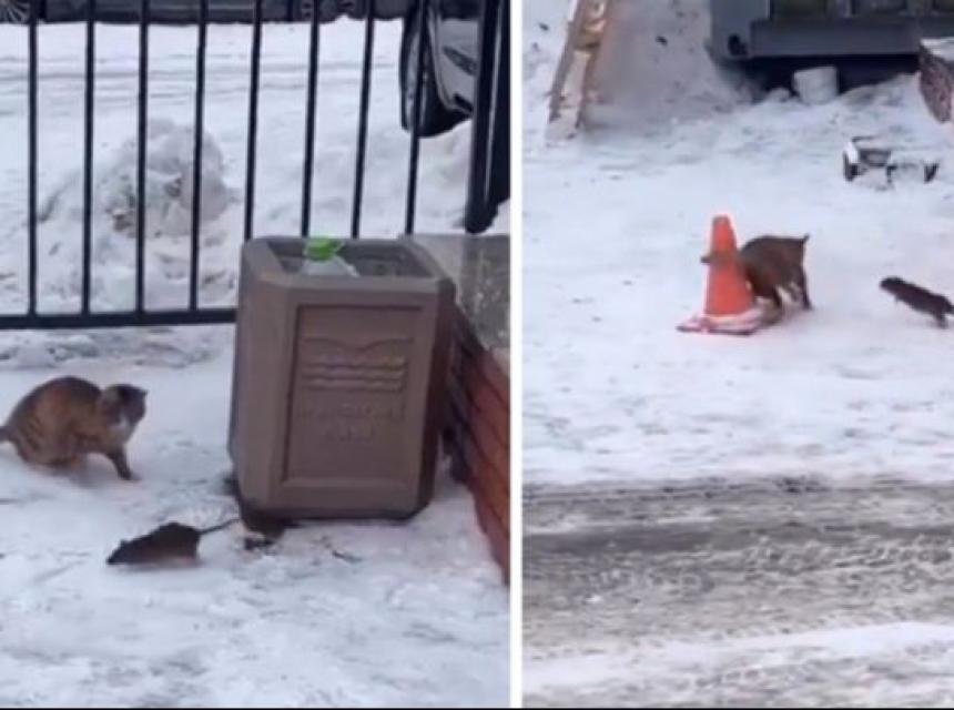 Mačka je na videu bila poprilično hrabra i odlučna u namjeri da ulovi štakora, a situacija se promijenila u samo nekoliko sekundi.