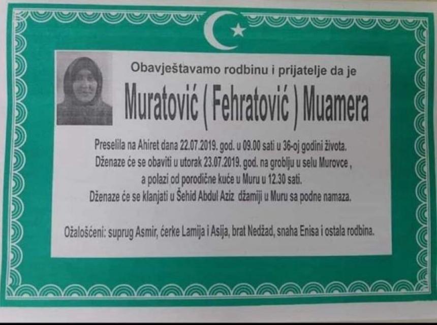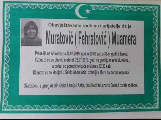 Tužnim srcem i bolim u duši javljamo rodbni, prijateljima, komšijama i poznanicima da je dana 22.07.2019. godine u 09.00 sati u 36-oj godini života na Ahiret preselila Muratović ( Fehratović) Muamera.