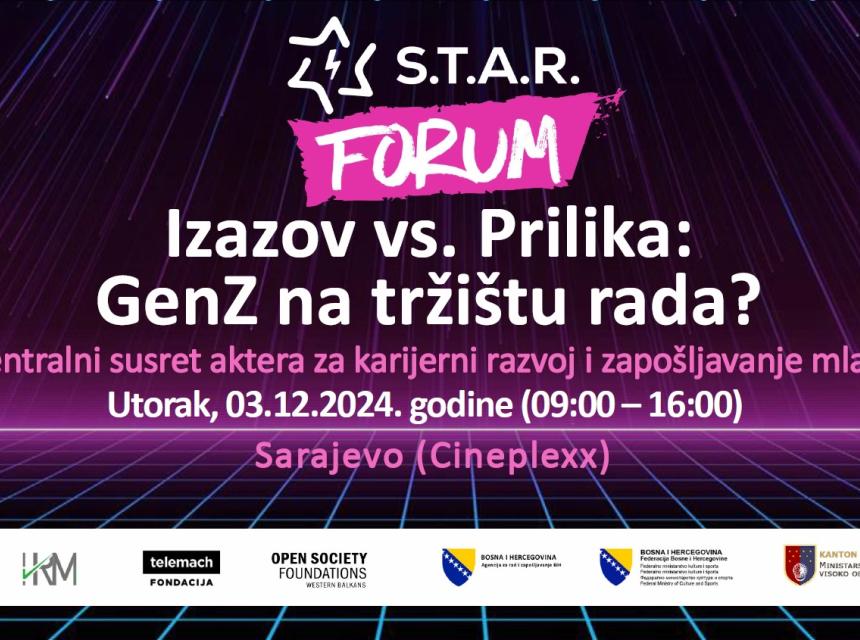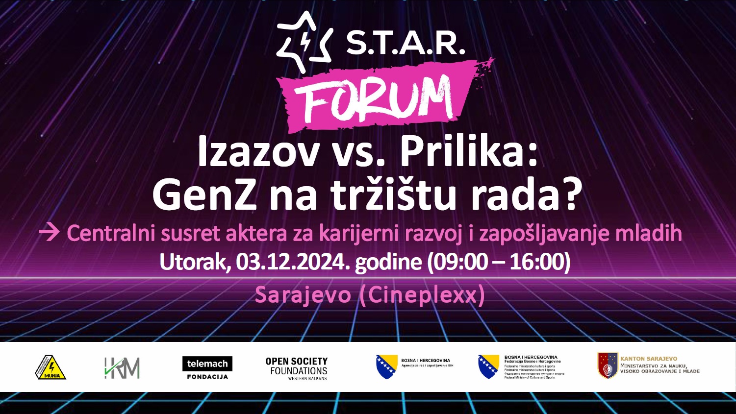 Danas 03.12.2024.godine u Sarajevu, u prostorijama Cineplexx kina, održava se S.T.A.R. forum pod nazivom “Izazov vs. Prilika: GenZ na tržištu rada?”