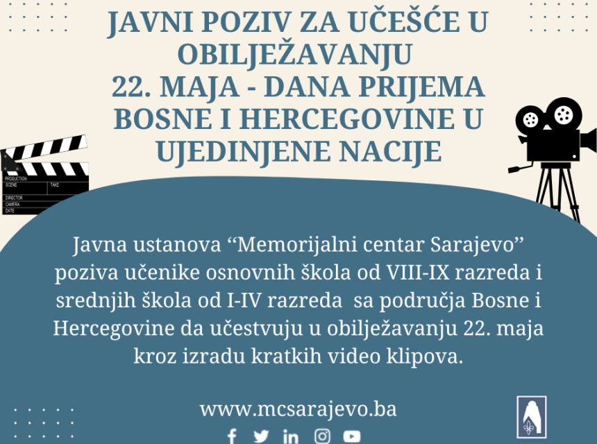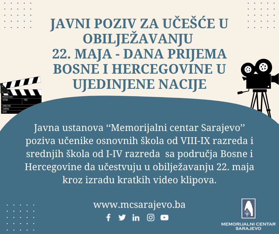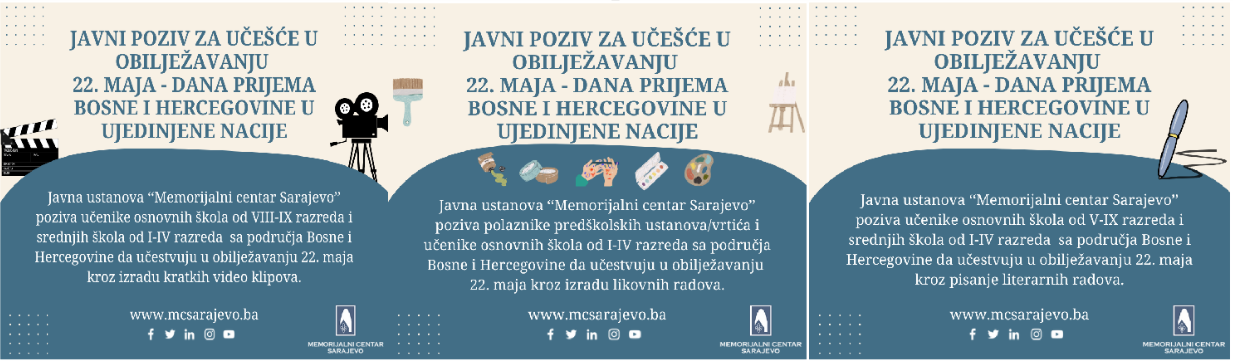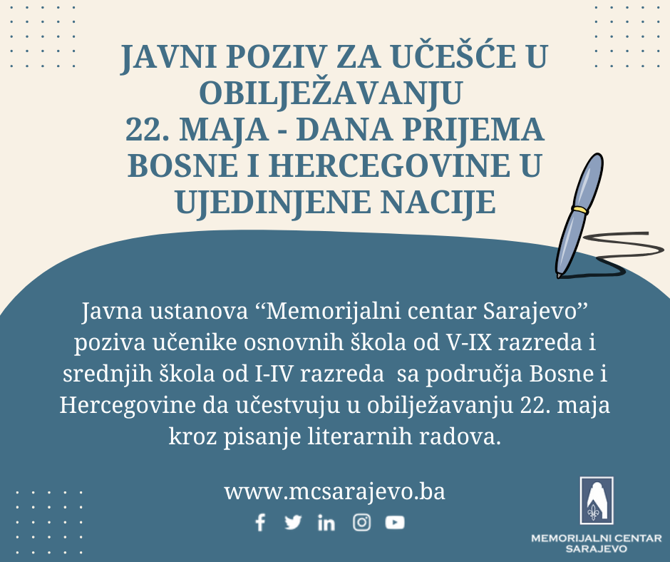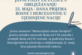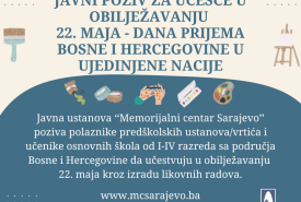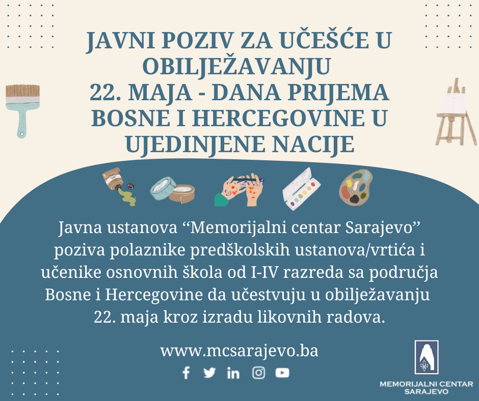 Povodom obilježavanja 22. maja – Dana prijema Bosne i Hercegovine u Ujedinjene nacije, Memorijalni centar Sarajevo objavljuje - Javni poziv za učešće učenika i djece iz cijele Bosne i Hercegovine, s ciljem poticanja mladih na razmišljanje o domovini, identitetu i zajedničkim vrijednostima kroz umjetničko i kreativno izražavanje.