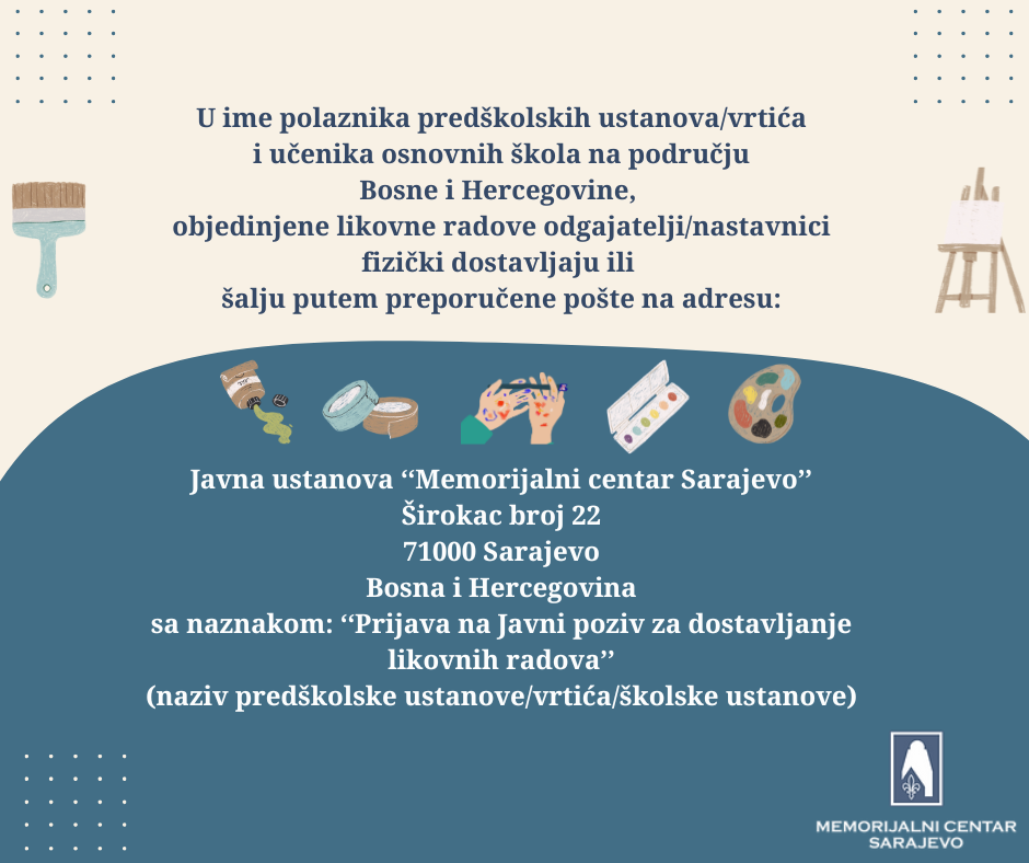Način dostave: Likovne radove u ime učesnika dostavljaju odgajatelji i nastavnici, fizički ili poštom, na adresu: Javna ustanova Memorijalni centar Sarajevo, Širokac broj 22, 71000 Sarajevo sa naznakom: „Prijava na Javni poziv za dostavljanje likovnih radova“ (navesti naziv predškolske ustanove/vrtića ili škole).