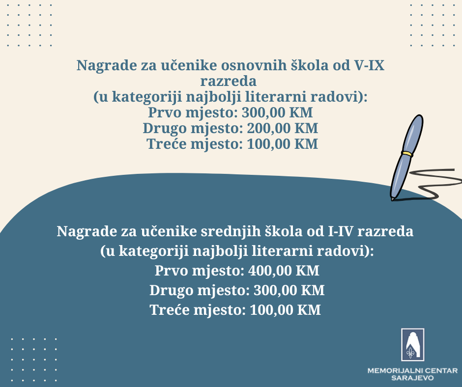 Literarne radove nastavnici/profesori šalju: poštom na adresu Memorijalnog centra (Širokac broj 22, Sarajevo) ili elektronski na e-mail: manifestacije@mcsarajevo.ba