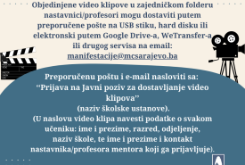 - putem preporučene pošte (na USB stiku ili hard disku), ili elektronski putem Google Drive-a, WeTransfer-a i sličnih servisa na: manifestacije@mcsarajevo.ba. E-mail i pošiljku nasloviti: „Prijava na Javni poziv za dostavljanje video klipova“ (navesti naziv škole). U nazivu svakog video klipa potrebno je navesti: ime i prezime učenika, razred, odjeljenje, naziv škole, te ime i kontakt nastavnika/profesora mentora.