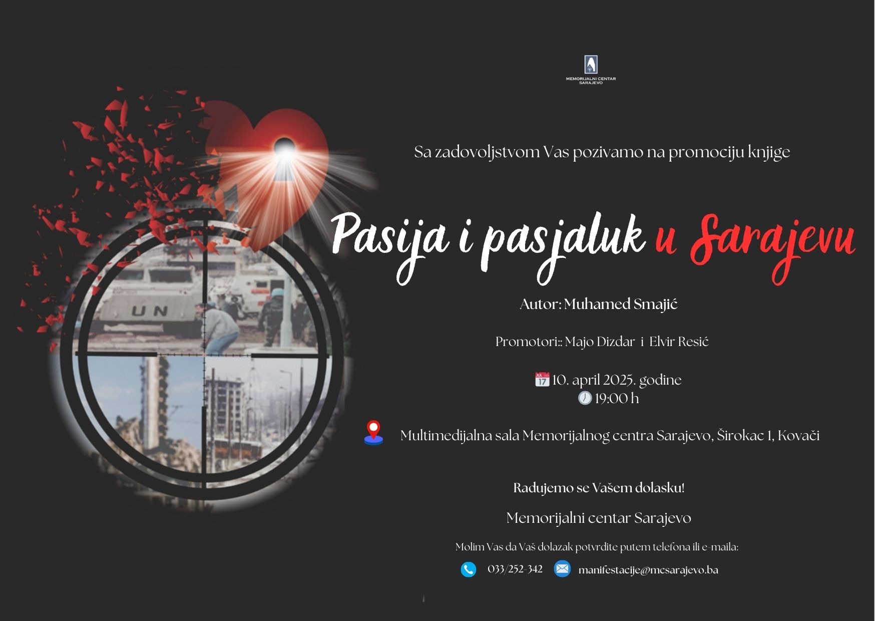 Roman “Pasija i pasjaluk u Sarajevu” donosi autentično svjedočanstvo o opsadi Sarajeva, prikazujući slojevitu sliku ljudskih sudbina, moralnih izazova i obavještajnih operacija koje su oblikovale tok historije, a koje su godinama ostale skrivene od očiju javnosti. Kroz snažnu prozu, autor nudi emotivno i dinamično svjedočanstvo o ljudskosti i slabostima u vremenu haosa. Autor Muhamed Smajić podijelit će s prisutnima lične uvide i iskustva koja su oblikovala ovu knjigu, pružajući dublje razumijevanje događaja sa linija odbrane Sarajeva i operacija koje su bile ključne za očuvanje grada. Ahmed Kulanić, direktor Memorijalnog centra Sarajevo, obratit će se prisutnima kao domaćin večeri, ministar za boračka pitanja Kantona Sarajevo Omer Osmanović će također govoriti, dok će promotori knjige biti Elvir Resić, profesor bosanskog jezika, magistar lingvističkih nauka, publicista i bivši generalni konzul BiH u Čikagu te Maja Dizdar, renomirani novinar, publicista i autor kriminalističkih romana i dokumentarnih filmskih scenarija. Večer će biti uveličana muzičkom izvedbom Eldina Huseinbegovića.
