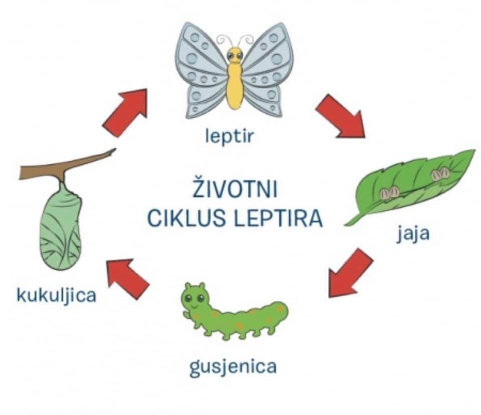 Postoje četiri faze leptirovog životnog ciklusa, jaje-larva-pupa i odrasli leptir.