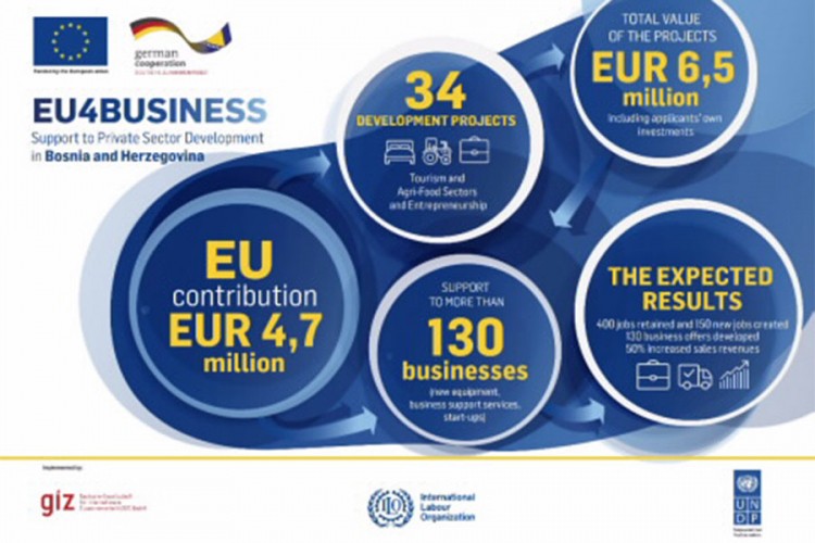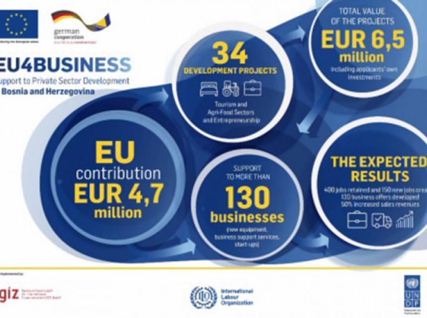 U okviru "EU4Business" ukupno je dostupno deset miliona bespovratnih sredstava EU koji će se koristiti kao podsticaj BiH ekonomiji i pomoć firmama, poljoprivrednicima i preduzetnicima u očuvanju radnih mjesta. Osim toga, projekat pomaže mladim i ženama preduzetnicima da pokrenu vlastitu djelatnost, a vrši i nova ulaganja u sektoru turizma, poljoprivrede i ruralnih područja, čime će se zajednicama u BiH omogućiti brži oporavak.