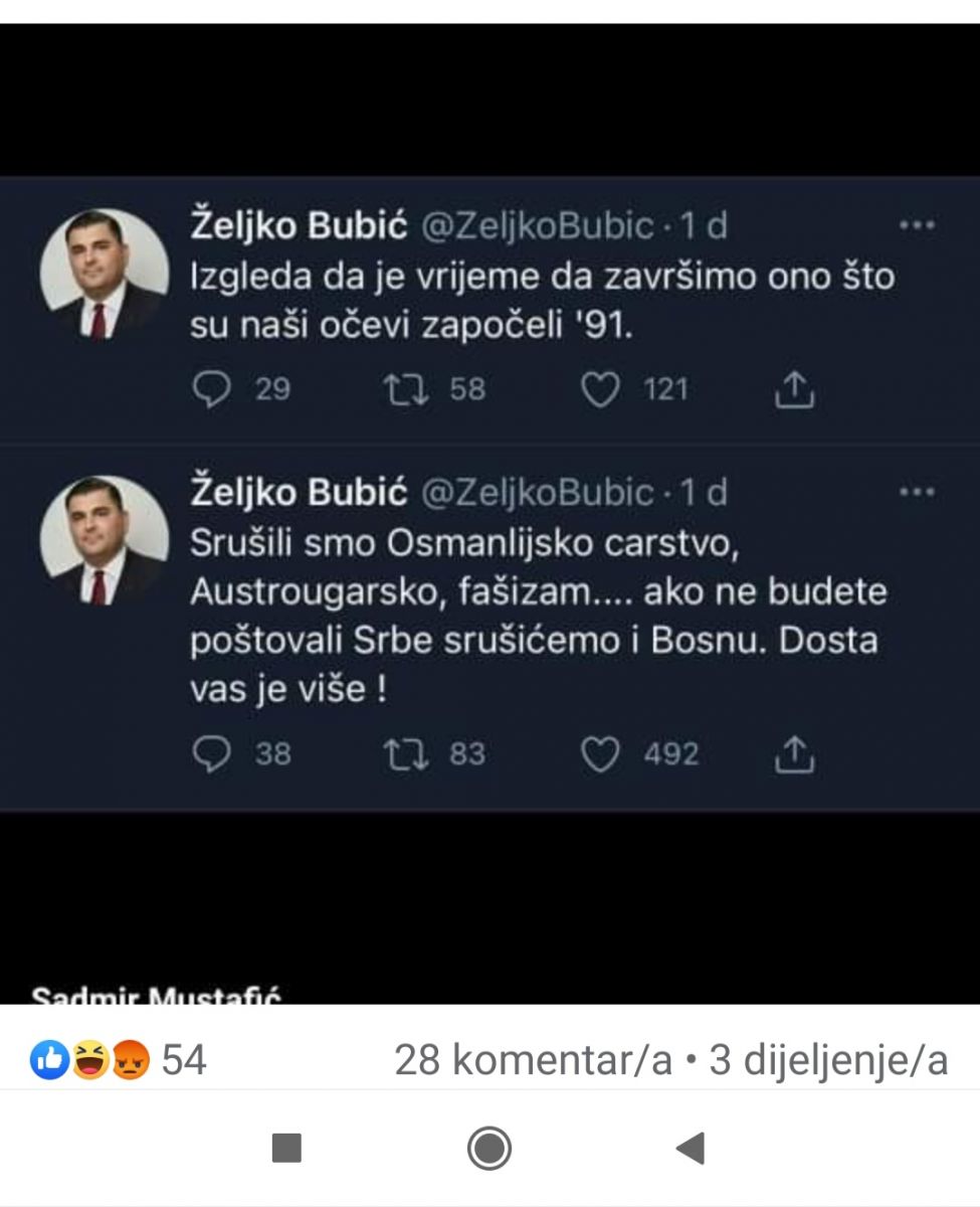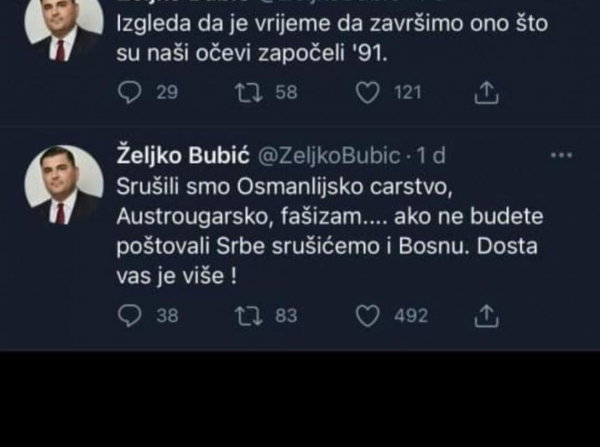 U drugoj piše: „Srušili smo Osmanlijsko carstvo, Austrougarsko, fašizam... ako ne budete poštovali Srbe srušićemo i Bosnu. Dosta Vas je više“!