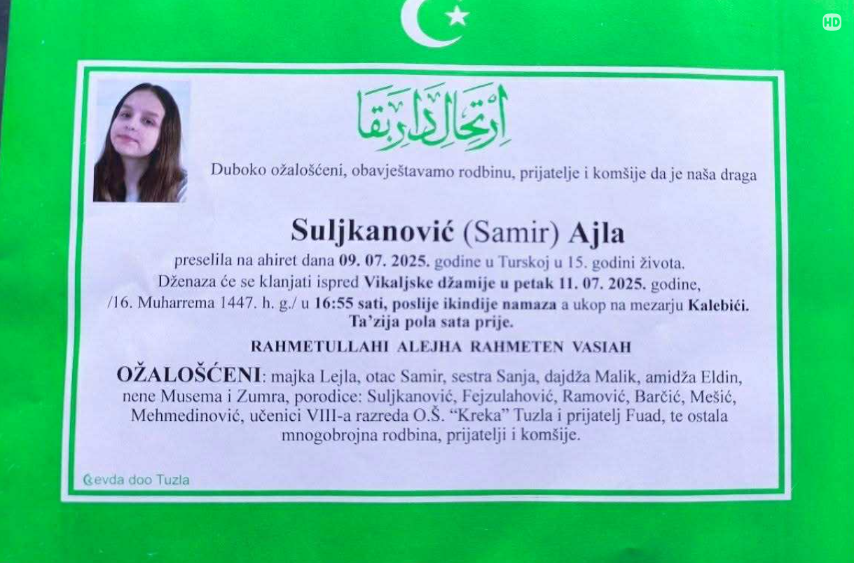Hrabra djevojčica Ajla Suljkanović iz Tuzle, koja je svojim osmijehom i snagom dirnula srca mnogih, preselila je na ahiret u svojoj 15. godini života.