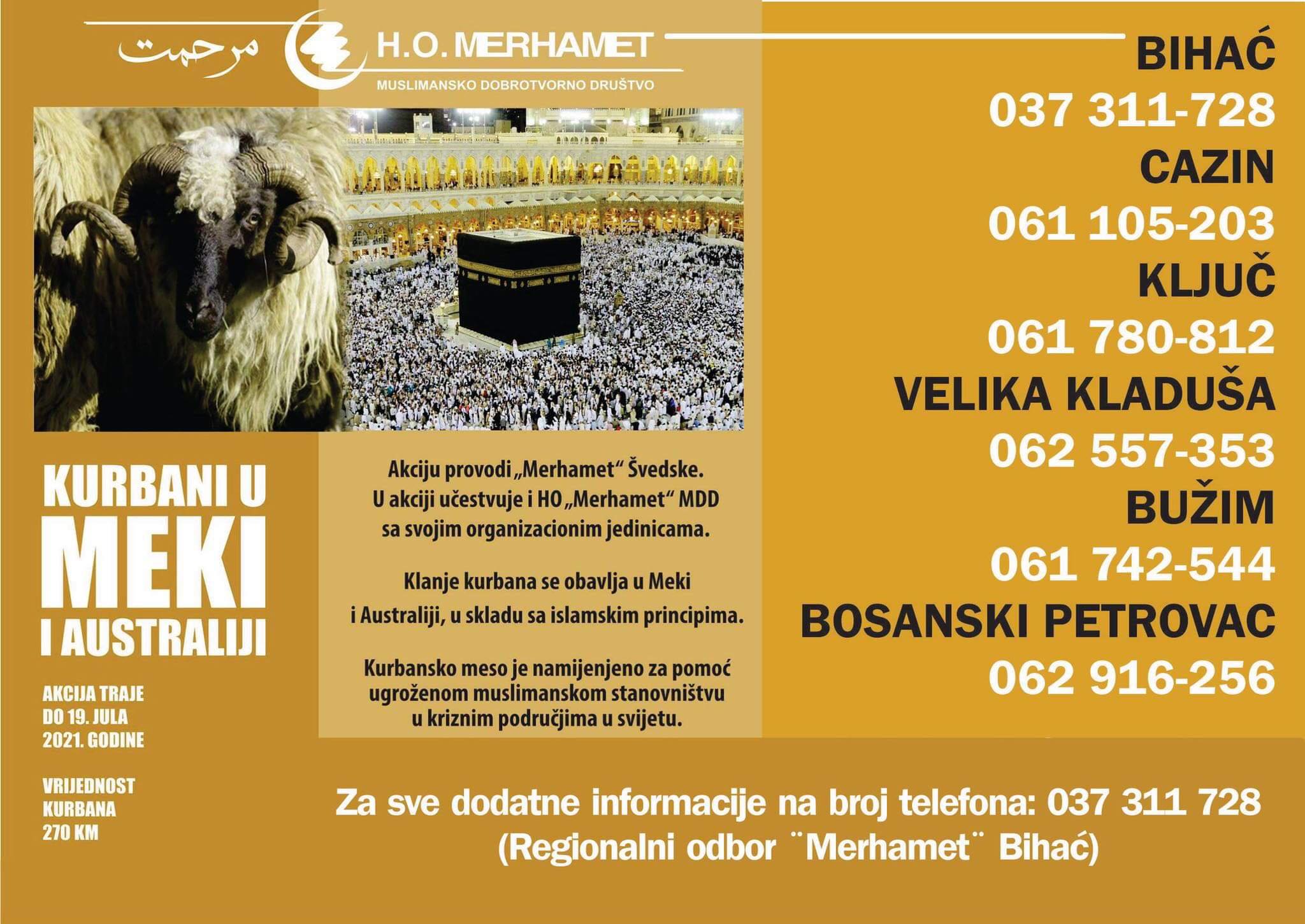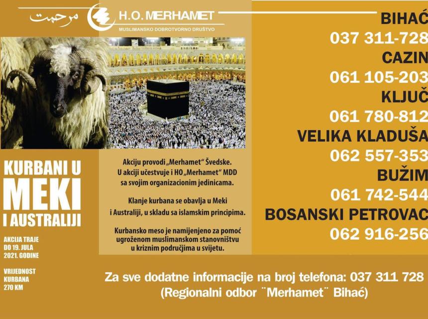 Muslimansko dobrotvorno društvo Merhamet Švedska, zajedno sa svim organizacionim jedinicama Merhameta u BiH organiziraju akciju Kurbani u Meki i Australiji za pomoć ugroženom muslimanskom stanovništvu u kriznim područjima u svijetu.