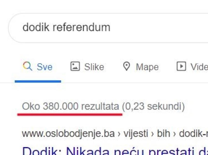 Sada više te najave nisu bezbrojne, dobile su svoj broj, obzirom da kada u Google pretraživač ukucate "dodik referendum", izbaci vam oko 380.000 rezultata, što se vidi iz priložene fotografije. Postoji ona stara poslovica, koja glasi: "Pas koji laje, ne ujeda."
