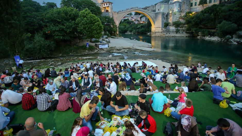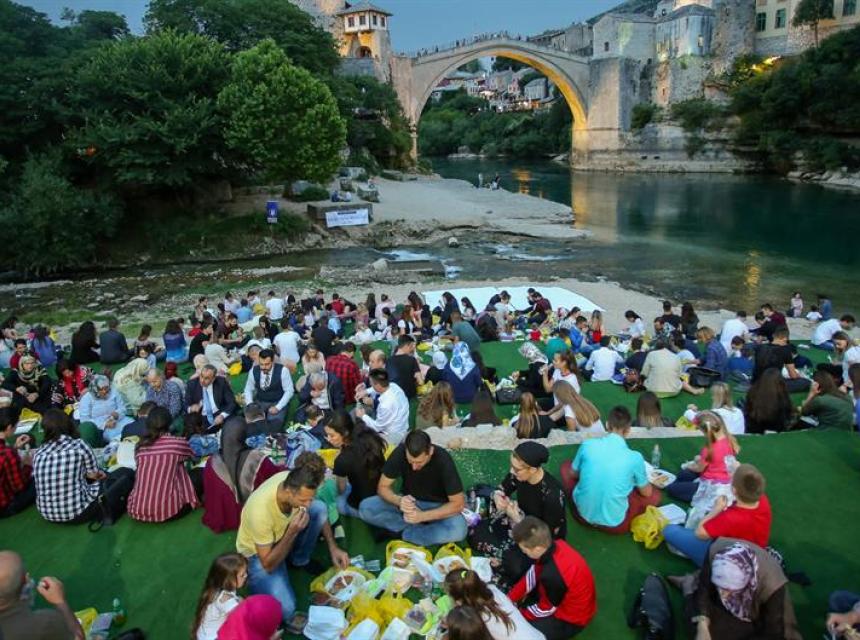 Klanjanje akšam-namaza i zajednički iftar na platou ispod Starog mosta u Mostaru, koji su organizirali Općina Bursa iz Republike Turske, Mostar Yunus Emre institut i Unija studenata Univerziteta "Džemal Bijedić" večeras je okupio oko 700 postača.