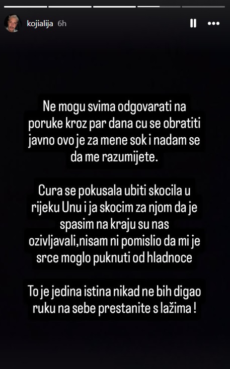 “Cura se pokušala ubiti skokom u rijeku Unu i ja skočim za njom da je spasim, na kraju su nas oživljavali. Nisam ni pomislio da mi je srce moglo puknuti od hladnoće. To je jedina istina, nikad ne bih digao ruku na sebe prestanite s lažima”, napisao je Ramakić.