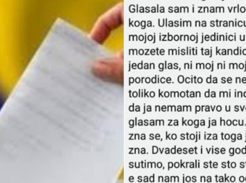 - Neko se našao da pogazi moje demokratsko i građansko pravo. Glasala sam i znam vrlo dobro za koga. Ulazim na stranicu CIK-a u mojoj izbornoj jedinici u Karadžama, možete misliti taj kandidat nema niti jedan glas, ni moj, ni mojih članova porodice. Očito da se neko našao toliko komotan da mi indirektno kaže da ja nemam pravo u svojoj državi da glasam za koga ja hoću. Ko su ti ljudi, zna se, ko stoji iza toga, još se bolje zna. Dvadeset i više godinama vam šutimo, pokrali ste što ste god mogli, e sad nam još na tako očit način uzimate i ovo malo slobode koju imamo. Uzmite!!!...Ima li još išta da uzmete? Sram vas bilo - napisala je Hadžiabdić-Karadža.