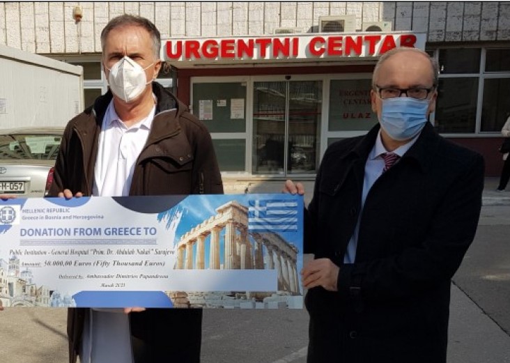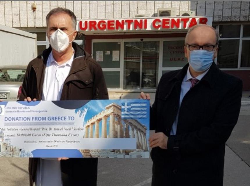 Ambasador Grčke u BiH Dimitrios Papandreou, uručio je danas Općoj bolnici "Prim. dr. Abdulah Nakaš", ček u vrijednosti od 50 hiljada eura, kao znak solidarnosti i podrške u borbi protiv pandemije Covid-19.