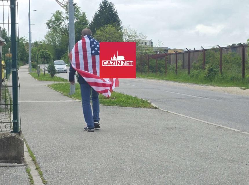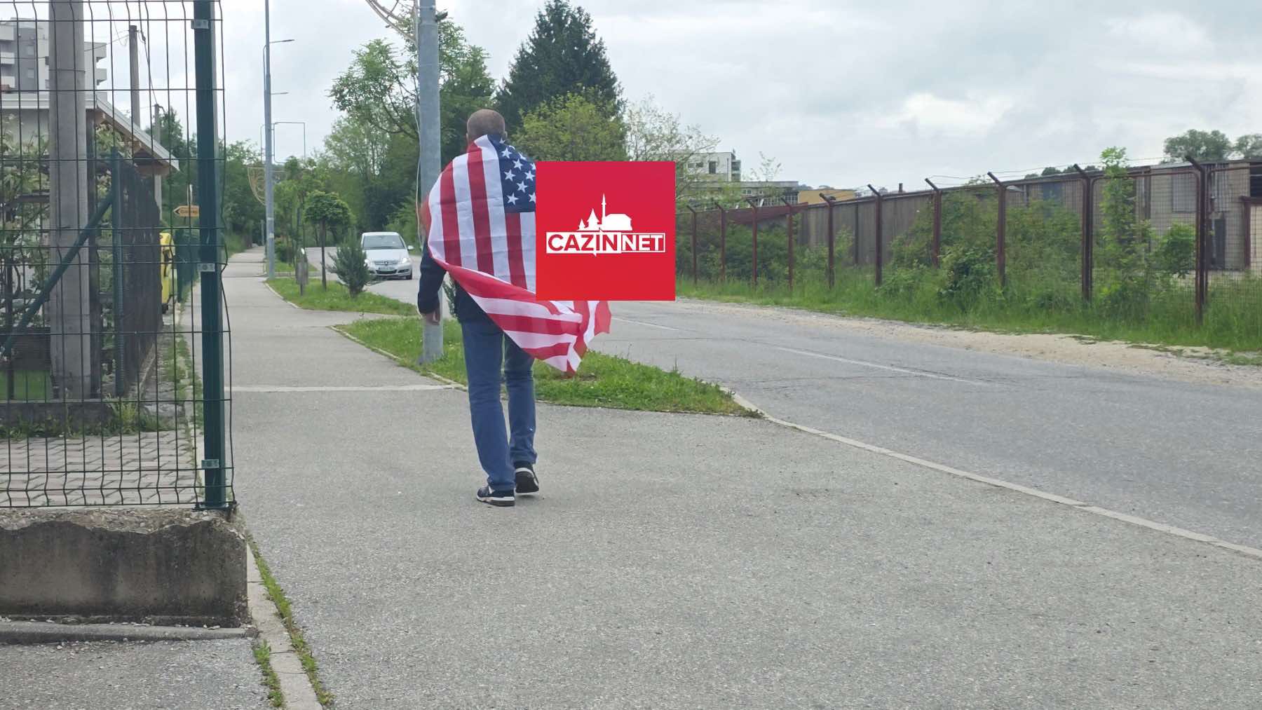 U centru Cazina danas je zabilježena neobična scena – muškarac ogrnut zastavom Sjedinjenih Američkih Država privukao je pažnju brojnih prolaznika.