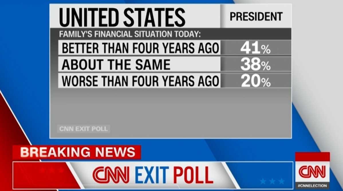 41% birača kaže da im je financijska situacija bolja sada nego prije četiri godine. 38% kaže da je ista, dok 20% kaže da je lošija nego prije četiri godine.