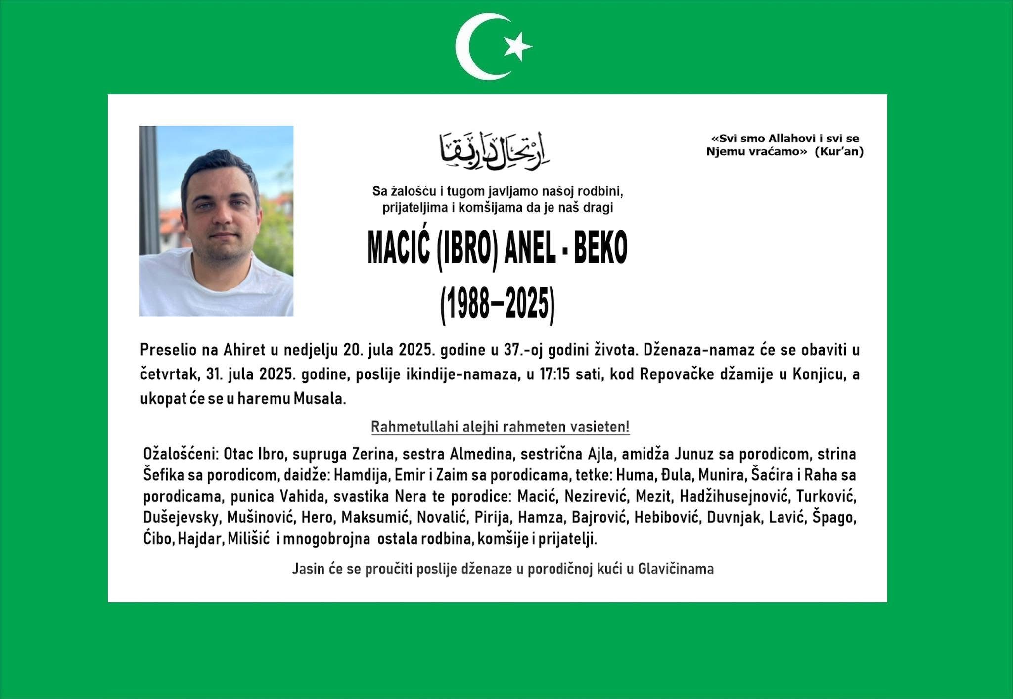 Preselio na Ahiret u nedjelju 20. jula 2025. godine u 37.-oj godini života. Dženaza-namaz će se obaviti u četvrtak, 31. jula 2025. godine, poslije ikindije-namaza, u 17:15 sati, kod Repovačke džamije u Konjicu, a ukopat će se u haremu Musala.