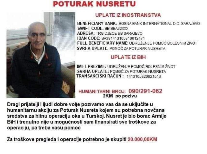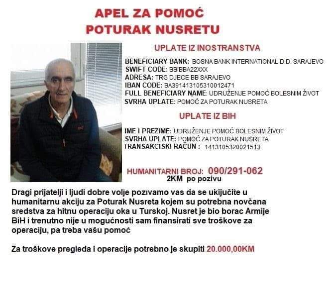 Novčana sredstva su potrebna za hitnu operaciju oka u Turskoj. Nusret je bio borac Armije BiH i trenutno nije u mogućnosti sam finansirati sve troškove za operaciju i treba Vašu pomoć.