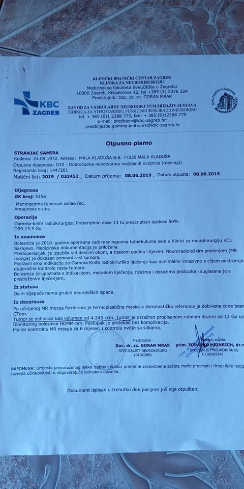 Operaciju tumora na glavi imala u KBC SARAJEVO.