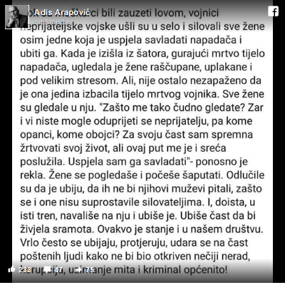 “Dok su muškarci bili zauzeti lovom, vojnici neprijateljske vojske ušli su u selo i silovali sve žene osim jedne koja je uspjela savladati napadača i ubiti ga. Kad je izišla iz šatora, gurajući mrtvo tijelo napadača, ugledala je žene raščupane, uplakane i pod velikim stresom. Ali, nije ostalo nezapaženo da je ona jedina izbacila tijelo mrtvog vojnika. Sve žene su gledale u nju. "Zašto me tako čudno gledate? Zar i vi niste mogle oduprijeti se neprijatelju, pa kome opanci, kome obojci? Za svoju čast sam spremna žrtvovati svoj život, ali ovaj put me je i sreća poslužila. Uspjela sam ga savladati"- ponosno je rekla. Druge žene se pogledaše i počeše šaputati. Odlučile su da je ubiju, da ih ne bi njihovi muževi pitali, zašto se i one nisu suprostavile silovateljima. I, doista, u isti tren, navališe na nju i ubiše je. Ubiše čast da bi živjela sramota. Ovakvo je stanje i u našem društvu. Vrlo često se ubijaju, protjeruju, udara se na čast poštenih ljudi kako ne bi bio otkriven nečiji nerad, korupcija, uzimanje mita i kriminal općenito!”, stoji na njegovom profilu.