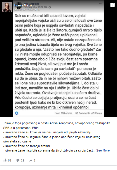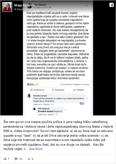 “Šta nam govori ova krasna poučna pričica iz pera našeg friško ustoličenog parlamentarca i doktora nauka i šefa najneuspješnijeg izbornog štaba u historiji SBB-a, Adisa Arapovića? Govori nam sljedeće: a) da su žene koje su silovane izgubile svoju "čast"; b) da je biti žrtva silovanja jedna velika sramota i c) da žena koja ima hrabrosti da se suprotstavi svom napadaču koliko-toliko još uspijeva povratiti izgubljenu čast, dok su ove druge za otpisati... Kao što možete vidjeti, na komentar jedne žene ispod njegovog posta znači li sve to da su silovane žene same krive za ono što im se desilo, naš doktor nauka, nekadašnja zvijezda civilnog sektora, a sadašnji megastar u usponu bh. političke scene, odgovara retoričkim pitanjem: "Pa jesu li?" Ne bih ja ovdje više ništa dodavala, niti oduzimala, mislim da je ovo zavrijedilo jedan pošten avazovski naslov sa etiketom "SRAMOTNO, SKANDALOZNO, ŠOKANTNO" i tako to, ali čini mi se i da taj tekst nećemo čitati u skorije vrijeme, nažalost... “, napisala je Radević.