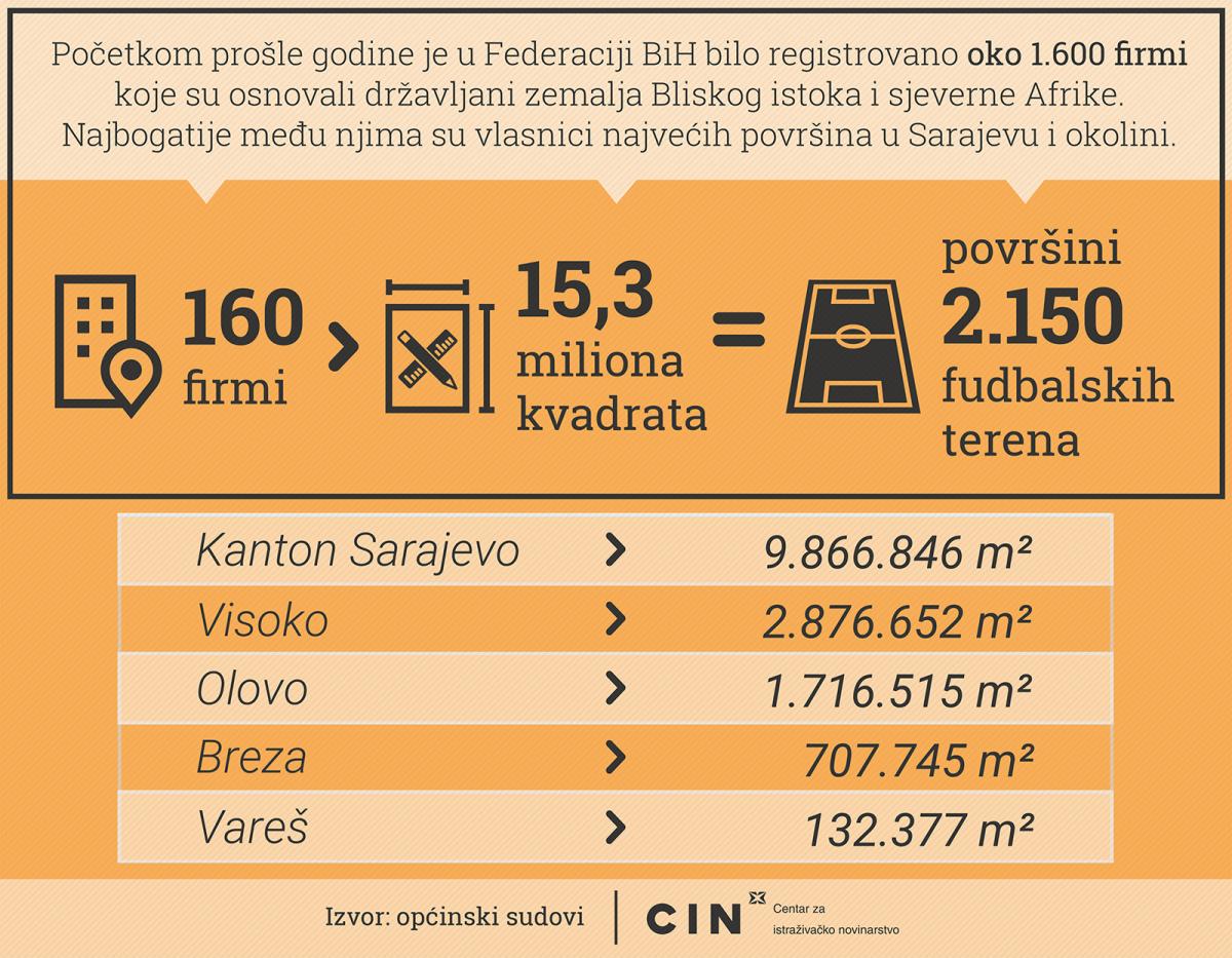 Riječ je o 15,3 miliona kvadratnih metara zemljišnih parcela dok se manji dio površine odnosi na 524 stana. Ova imovina je u proteklih sedam godina uknjižena na 160 firmi. Njihovi vlasnici su državljani: Saudijske Arabije, Kuvajta, Ujedinjenih Arapskih Emirata, Katara, Jordana, Sirije, Egipta, Libije te drugih zemalja.