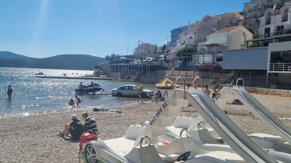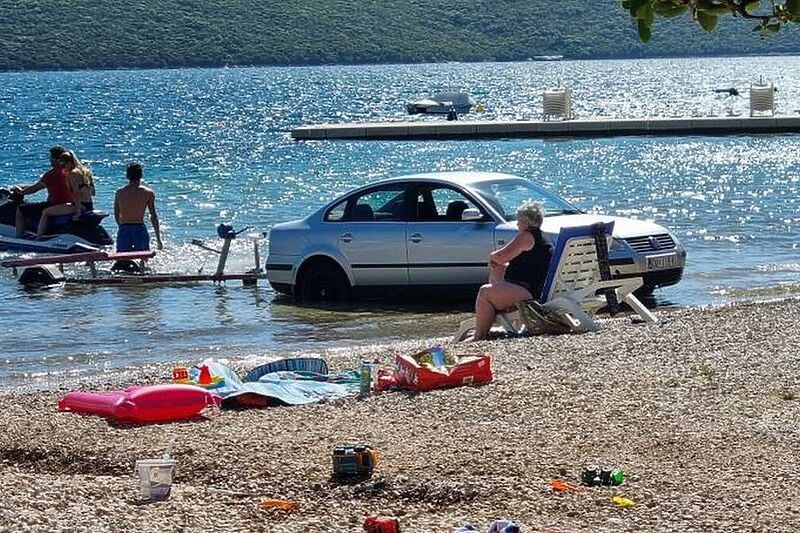 Kako se vidi na fotografijama, vozač je automobilom sišao na plažu i ušao u more. Automobil je tom prilikom imao zakačenu prikolicu.