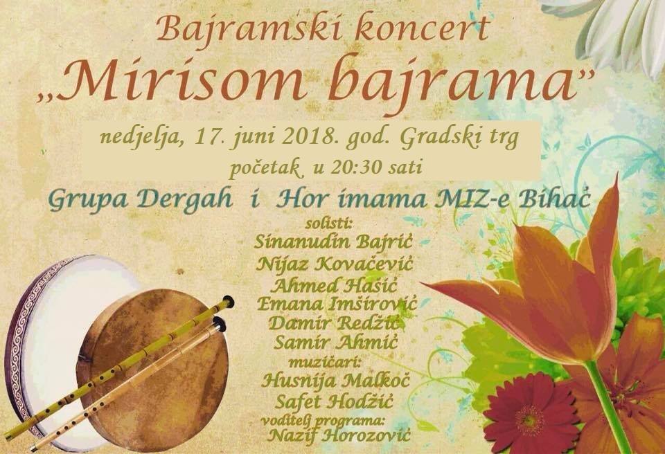 Dakle, bajramski koncert „Mirisom Bajrama“ održat će se u nedjelju 17. juna 2018. godine od 20:30 sati na gradskom trgu u Bihaću. Prije samog programa, Medžlisa IZ Bihać poziva sve građane da se u 20:00 sati okupe pred džamijom Fethija kako bi ih počastili sladoledom, a odrasle bajramskim kolačima.
