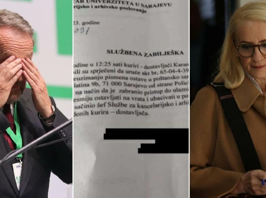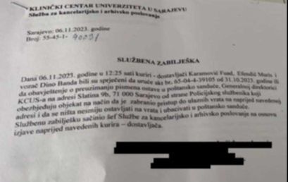 - Dana 06.11.2023. godine u 12:25 sati kuriri – dostavljači Karamović Fuad, Efendić Muris i vozač Dino Banda bili su spriječeni da uruče akt br. 65-04-4-39105 od 31. 10. 2023. godine ili da obavještenje o preuzimanju pismena ostave u poštansko sanduče generalnoj direktorici KCUS-a na adresi Slatina od strane Policijskog službenika koji obezbjeđuje objekat na način da je zabranio pristup do ulaznih vrata na naprijed navedenoj adresi i da se ništa ne smiju ostavljati na vrata i ubacivati u poštansko sanduče. Službenu zabilješku sačinio je šef Službe za kancelarijsko i arhivsko poslovanje na osnovu izjave naprijed navedenih kurira – dostavljača.