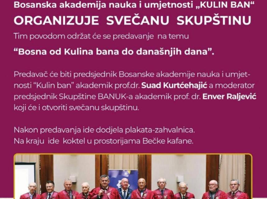 Bosanske akademije nauka i umjetnosti "Kulin ban" organizira svečanu skupštinu koja će se održati u Hotelu Evropa 29. avgusta s početkom u 13 sati.