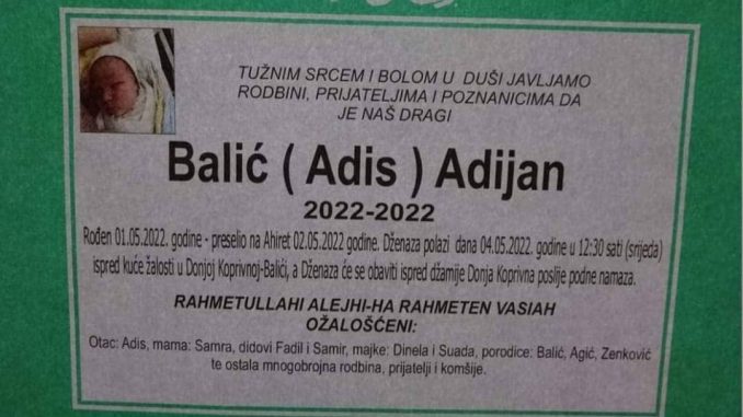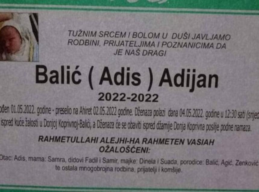 Tužnog srca i s bolom u duši obavještavamo rodbinu, komšije i prijatelje da je naš dragi Balić (Adis) Adijan dana 2.5.2022. preselio na Ahiret. Imao je samo jedan dan, rođen je 1.5.2022.godine.