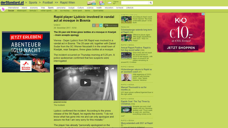 Dejan Ljubičić, fudbaler Rapida iz Beča, koji bilježi 14 nastupa u tamošnjoj Bundesligi, i Danijel Sudar također državljanin Austrije koji igra niželigaški fudbal, privedeni su nakon što je utvrđeno da su bacali pivske flaše na Gradsku džamiju u Kiseljaku.