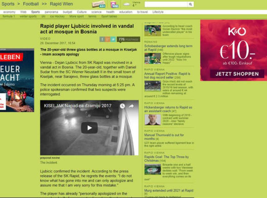 Svjetski mediji su prenijeli lokalnu vijest kako su austrijski fudbaleri bh. porijekla snimljeni nadzornim kamerama kako vandaliziraju džamiju u Kiseljaku.