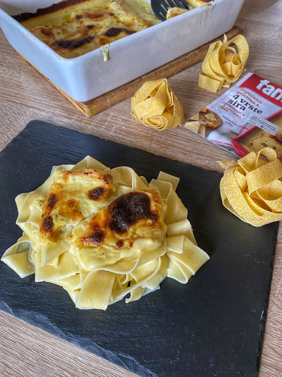 Za prilog sam odlučila tjesteninu, naravno možete nešto po vašem izboru. Ja sam izabrala Zlato Valjane rezance sa jajima koji su gotovi bukvalno za 5 minuta kuhanja. Kada su skuhani ocijedite ih te dodajte malo putera i soli. Stavite na tanjir tjesteninu te preko njih poslužite piletinu. Odlična kombinacija, gotova za čas posla.