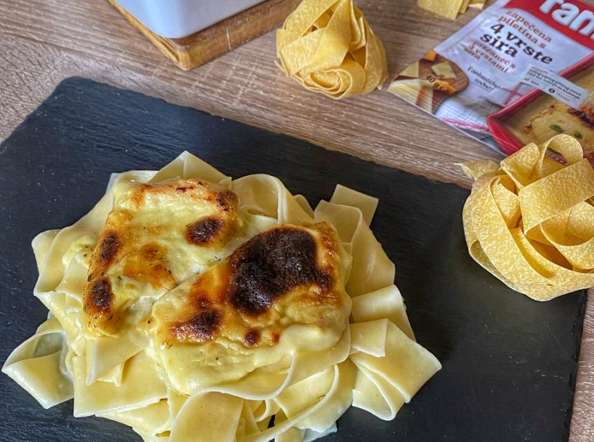 Pripremite oko 400 grama pilećih prsa izrezanih na šnicle te stavite u vatrostalnu zdjelu. U posebnu zdjelu pripremite Fant umak od 4 vrste sira za piletinu sa 250 ml vrhnja i 100 ml vode. Pomiješajte dobro te prelijte preko piletine, možete dodati npr. gljive po vašem izboru ili kao ja dodate na vrh još malo trapist sira ili mozzarele. Pospite malo peršuna i pecite u rerni na 200 stepeni nekih pola sata.