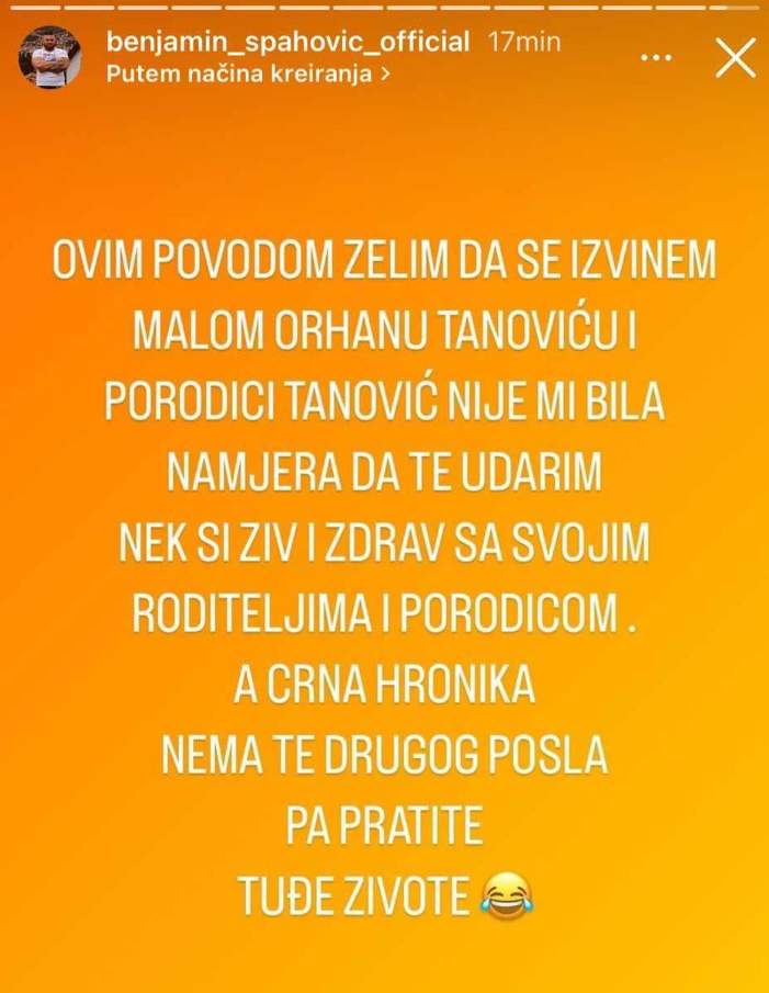 Nakon objavljenog članka na portalu Crna-Hronika, Benjamin Spahović se na svom instagram profilu javno izvinio porodici Tanović. Kako kaže, nije mu bila namjera da udari maloljetnog Orhana.
