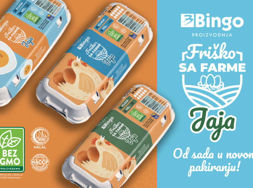 Uz prepoznatljivi kvalitet, jaja sa Bingo Farme od sada dolaze u novom, redizajniranom pakovanju uz oznaku „Friško sa Farme“. Novo dizajnersko ruho i odabir kartonske ambalaže za sve veličine, koji će biti uvođeni postepeno u narednom periodu, odražavaju predanost kompanije Bingo inovacijama i tržišnim trendovima.