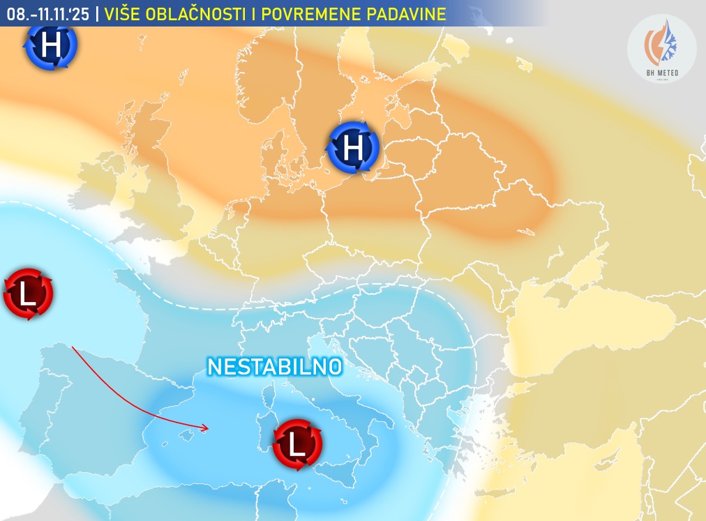"Od jutarnjih sati subote (8. novembar) jače naoblačenje u cijeloj zemlji, tako da će vikend proteći u znaku pretežno oblačnog vremena u cijeloj zemlji. Kiša u početku samo lokalno, uglavnom na jugu i jugoistoku, a od večernjih sati nedjelje (9. novembar) i u toku ponedjeljka (10. novembar) kiše će biti u cijeloj zemlji. U ponedjeljak na višim planinama moguće i malo snijega. Prestanak padavina u večernjim satima ponedjeljka.
