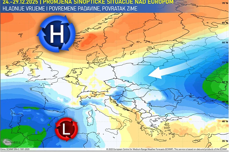 Glavnina padavina se očekuje u periodu od srijede (24.12.) do petka (26.12.) kada bi ih bilo u većem dijelu zemlje, ali po trenutnim prognozama ništa obilno. Snijeg najprije moguć u višim krajevima, a onda u četvrtak i petak moguće da se lokalno spusti i do nizina.