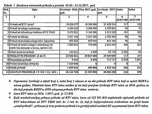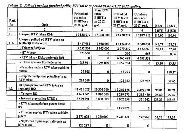 "Od ukupno evidentiranog prihoda BHRT-a od RTV takse za period januar-decembra 2017. godine, stvarno naplaćeno (novčani priliv) iznosi 9.703,480 KM, što čini 45,3 posto novčanog priliva u odnosu na evidentirani prihod. Novčani priliv po ovom osnovu manji je za 11.716,733 KM od njiženog prihoda u poslovnoj evidenciji BHRT-a. Priliv novca za RTV taksu u periodu januar-decembra 2017. godine manji je za 1.623,157 KM u odnosu na period januar-decembar 2016. godine kada je ukupni priliv po ovom osnovu iznosio 11.326,637 KM", piše u Izvještaju BHRT-a.