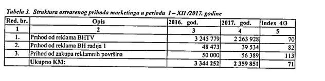 "Osnovni faktori koji su determinisali poslovanje marketinga u 2017. godini bili su: uopćena teška situacija na i oko BHRT-a, nedostatak realnih programskih planova na osnovu koji se mogao planirati rad marketinga, te nastavak trenda pada budžeta oglašivača u BiH (iz godine u godinu), koji je direktno proporcionalan jačanju nelojalne konkurencije kabel operatera i stranih TV stanica", piše u Izvještaju.