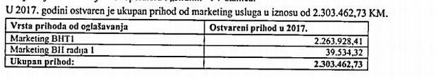 BHRT je osim novčanog priliva po osnovu RTV takse u periodu od januar-decembar 2017. godine, BHRT je s RTRS-om izvršio kompenzaciju međusobnih obaveza i potraživanja po osnovu RTV takse - inkaso i prinudna naplata u ukupnom iznosu od 1.144,330 KM. Prihodi po osnovu pruženih usluga marketinga iznose 2.359,851 KM i u odnosu na Plan manji je za 6 posto, dok je u odnosu na isti period 2016. godine manji za 29 posto.