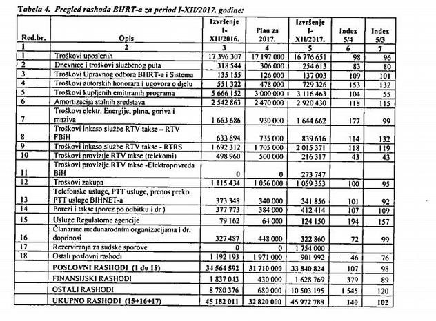 U Izvještaju se navodi da troškovi zaposlenih u BHRT-u iznose 16.776,651 KM i obuhvataju troškove bruto plaća, ishrane, prijevoza i naknade za pomoć zaposlenim.