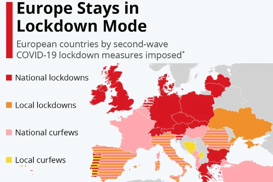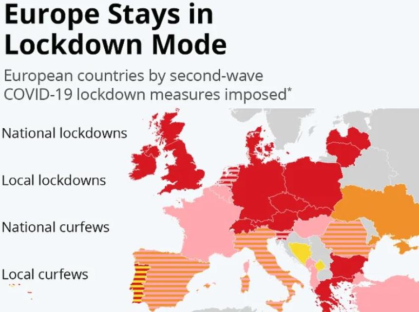 Iako je period ljeta djelovao optimistično brojne velike države poput Njemačke, Velike Britanije, Francuske, Turske, Italije i Austrije, ali i onih manjih članica EU kao što je Slovenija već sedmicama ili mjesecima su u "tvrdom" ili "blažem" lockdownu. Vlasti teško odgovaraju valovima pandemije i svakodnevno se bore suzbiti širenje virusa često mijenjajući taktike borbe. U brojnim evropskim zemljama ne rade restorani, kafići i prodavnice neesencijalne robe, dok je i policijski sat ili ograničeno kretanje određenim danima (vikenda) mjera kojoj su pritekle brojne evropske zemlje.