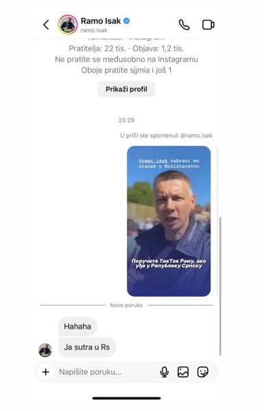 Ministar Isak nije ostao dužan, već je odgovorio privatno u poruci preko svojeg Instagram profila, nakon što ga je neko označio na storyju.