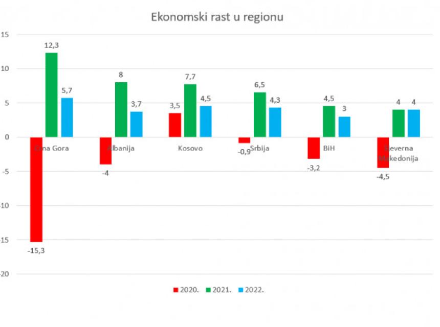 Ipak, nas u Bosni i Hercegovini može zabrinjavati to što se od svih država zapadnog Balkana našoj zemlji predviđa najmanji rast. Učinak Bosne i Hercegovine čak je premašio očekivanja u drugom tromjesečju 2021. godine uz oporavak vanjskih tržišta i snažan rast domaće privatne potrošnje, podržan baznim efektima. Izvoz roba i usluga realno je porastao za više od 50 posto na godišnjem nivou, zahvaljujući snažnom oporavku u EU, našem glavnom izvoznom tržištu. Kratkoročni pokazatelji trgovine na malo i industrije upućuju na nastavak ekspanzije industrijske proizvodnje i usluga u trećem tromjesečju. Očekuje se da će se ove godine naša ekonomija povećati za 4,5 posto u 2021. i 3,0 posto u 2022. godini.