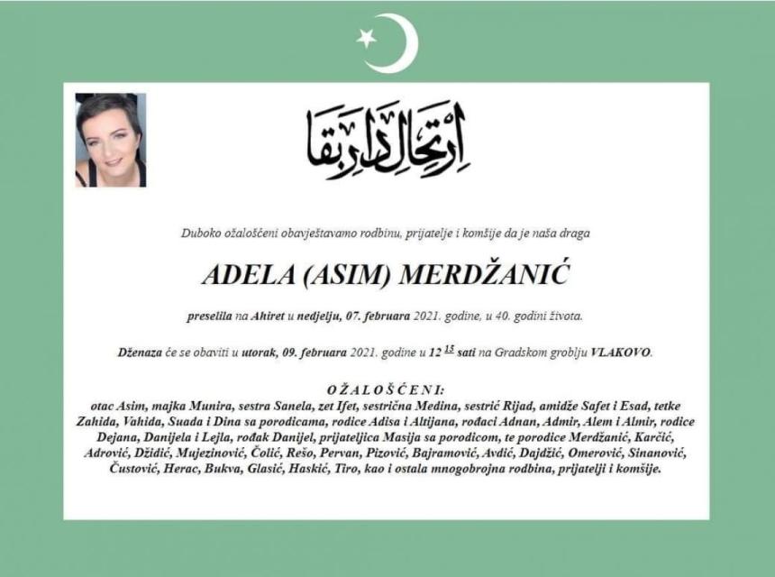 Dženaza i ukop Adele Merdžanić obavit će se danas na Gradskom groblju Vlakovo u 12:15h sati, objavio je ŽRK Ilidža na svojoj Facebook stranici.
